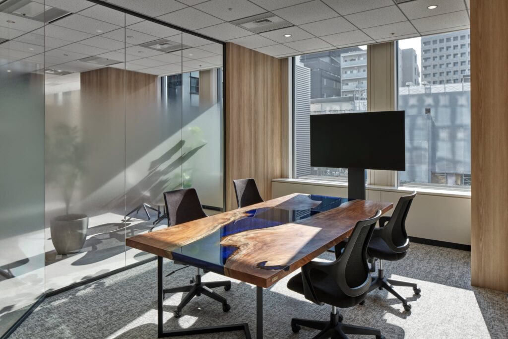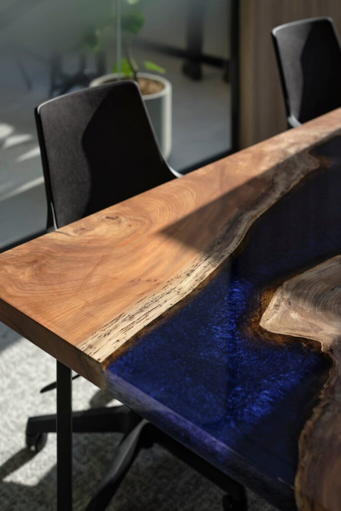 カラーレジンの上に一枚板の耳部分が乗るような、原木本来のかたちを活かしたデザインとなりました。
